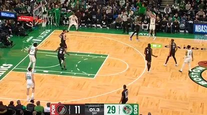 第一节比赛,普里查德超远压哨三分再中,凯尔特人首节领先开拓者21分。